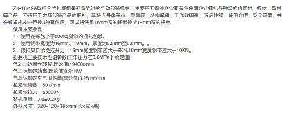 ZK-16/19A型组合式气动钢带主要用于捆扎包装彩色卷板和外包装使用木箱的产品,也适用于木制品业、造纸业、玻璃制造业的产品捆扎包装。其特点是以操作者的双手为动力,操作灵活方便、快捷。适应任何场地作业。本机不使用锁扣、降低了包装成本。